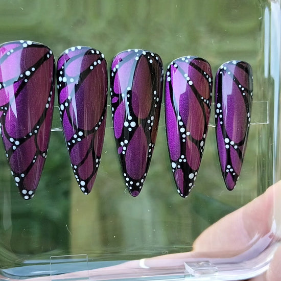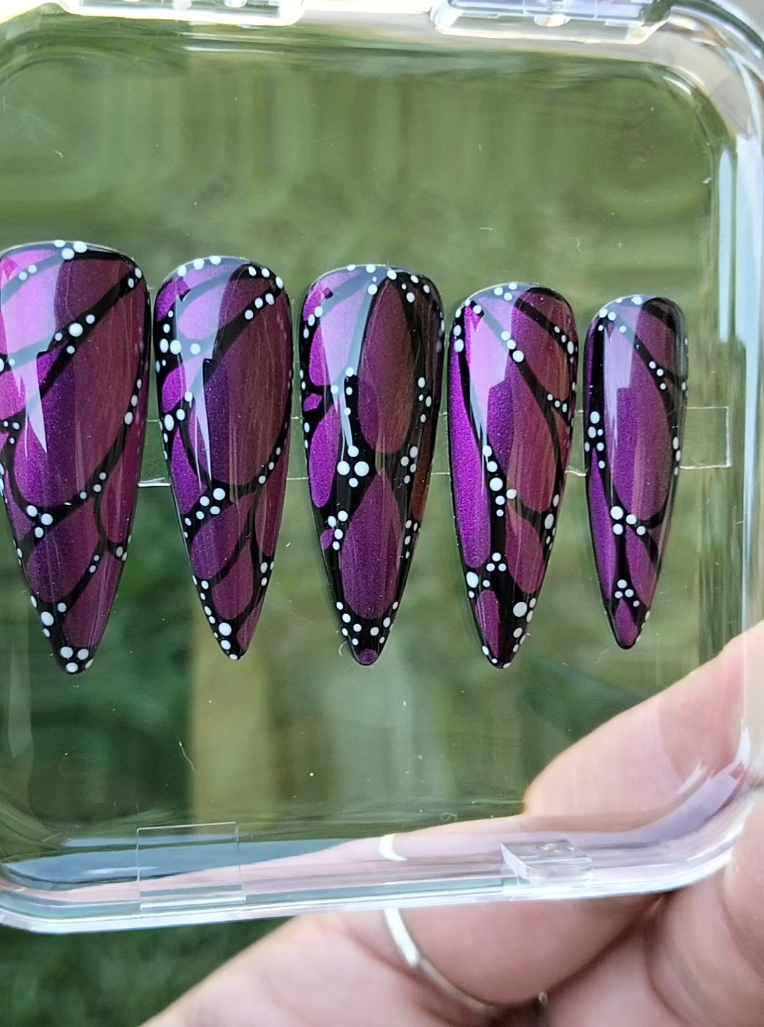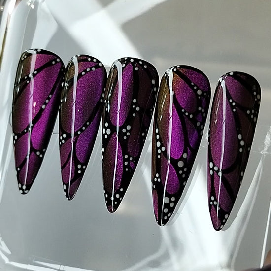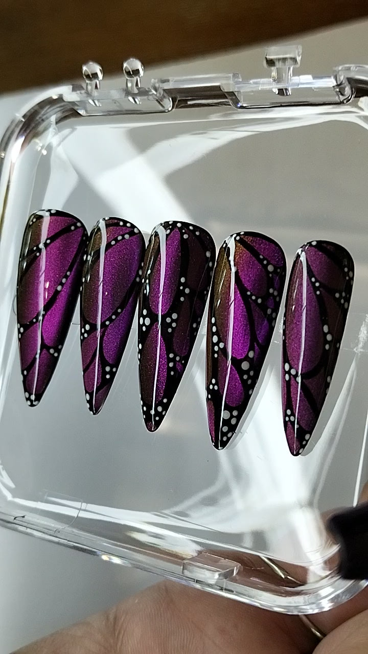 🦋 🌇 Twilight Bloom captures the fleeting beauty of transformation—where day melts into night and color dances on the edge of shadow. A radiant base shifts from deep violet to magenta, flickering with flashes of sunset orange, golden yellow, and forest green. Black butterfly wing patterns stretch across each nail, accented with delicate white dots like stardust on velvet. This set is a tribute to metamorphosis, mystery, and the magic of becoming—perfect for rituals of renewal, self-expression, or simply fluttering through the world with intention.