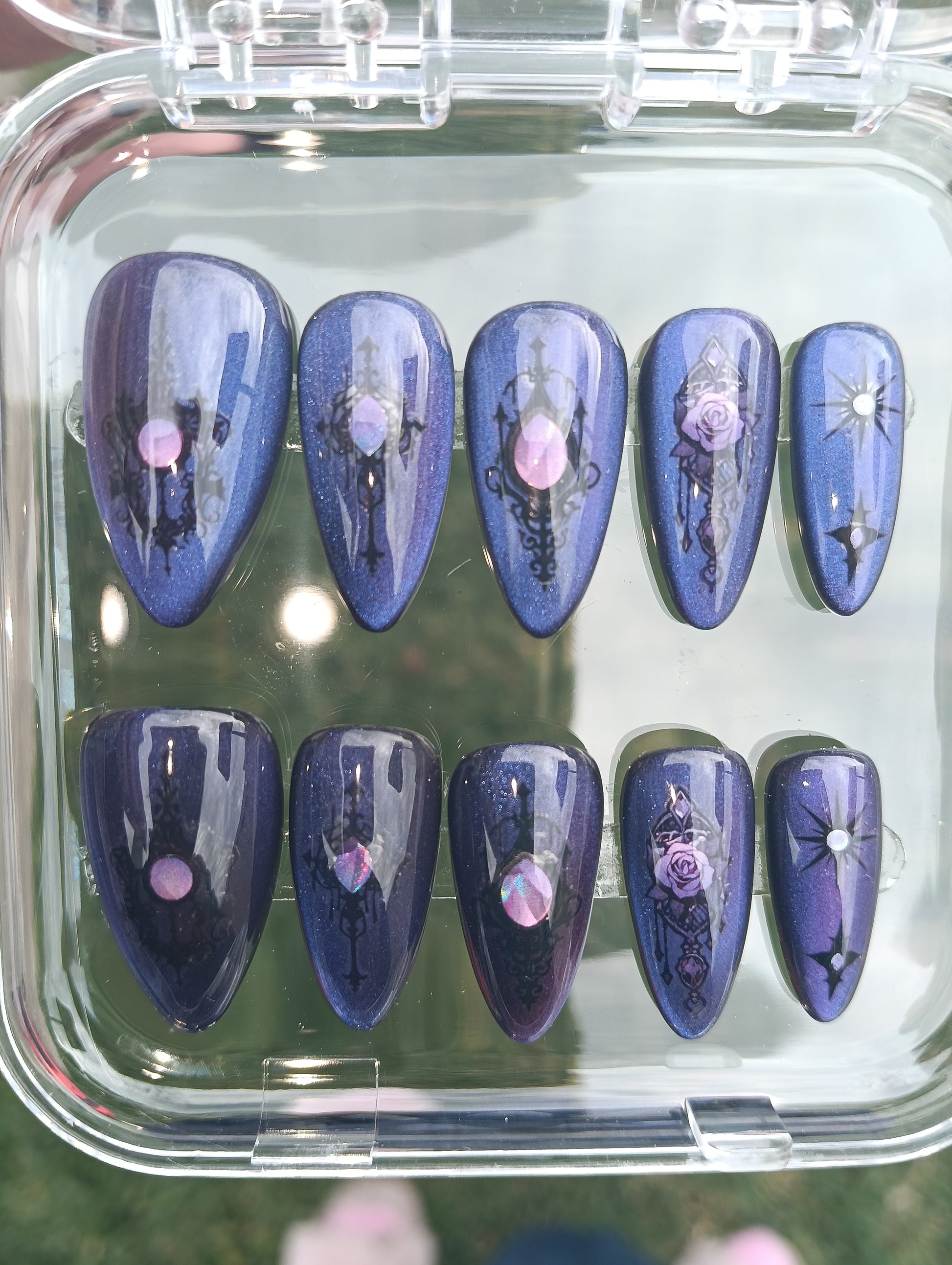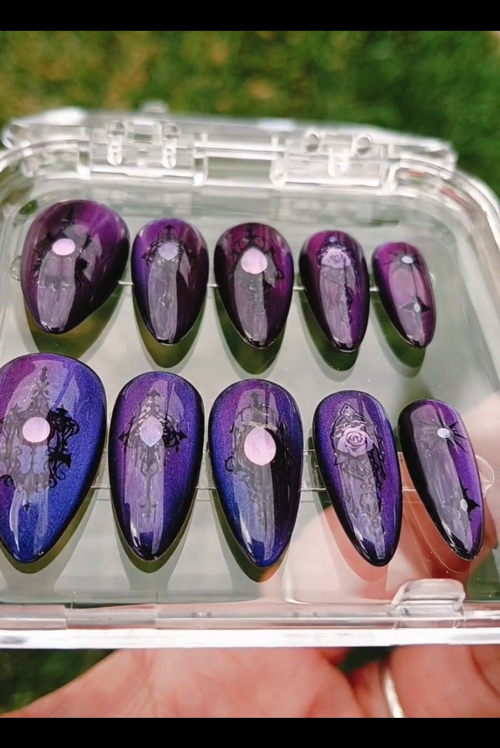 This set is for the gothic dreamer, the moonlit mystic, the one who finds beauty in the melancholic and divine. Let your hands become relics of reverence, wrapped in cosmic dusk and sacred glamour.