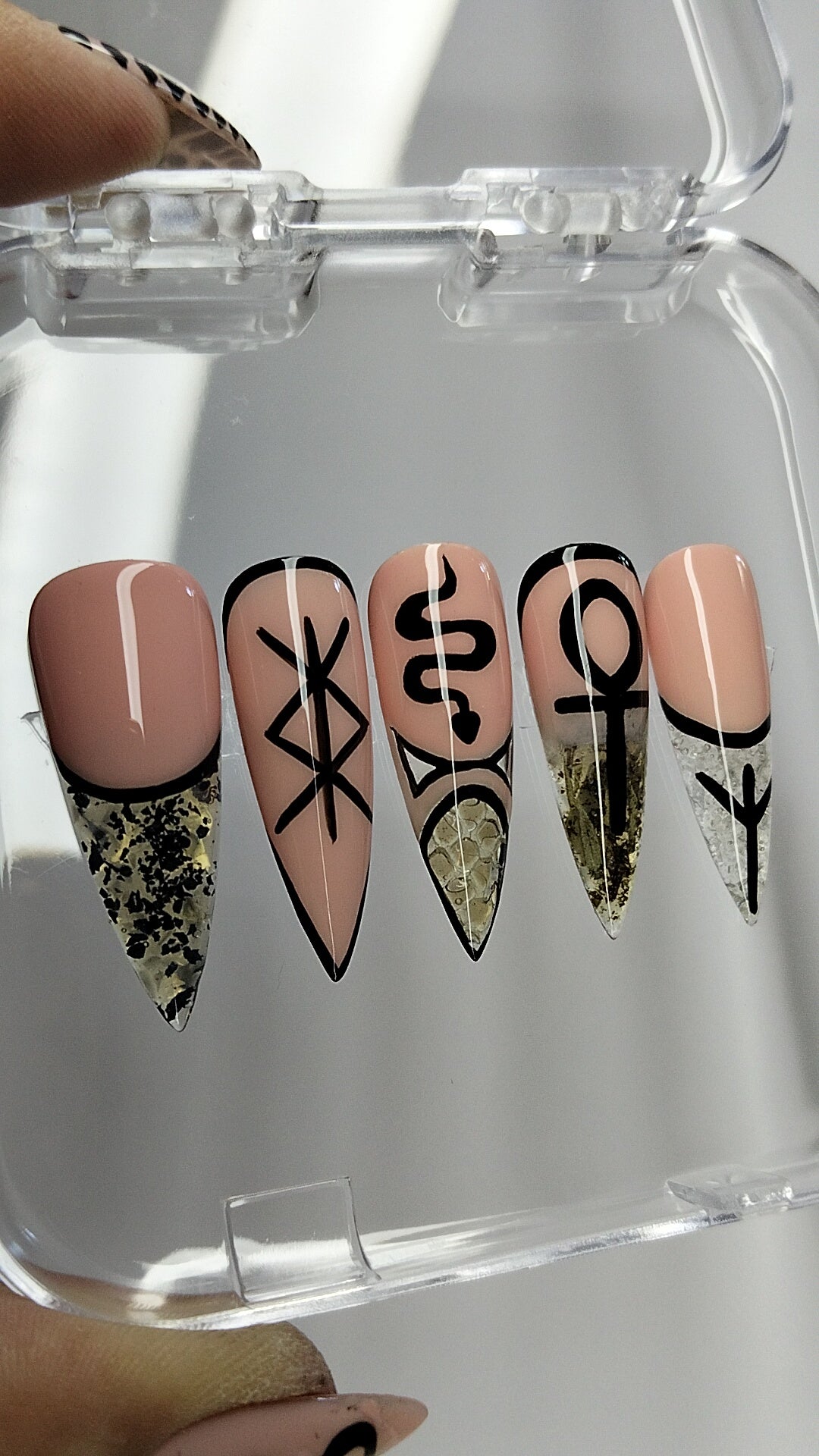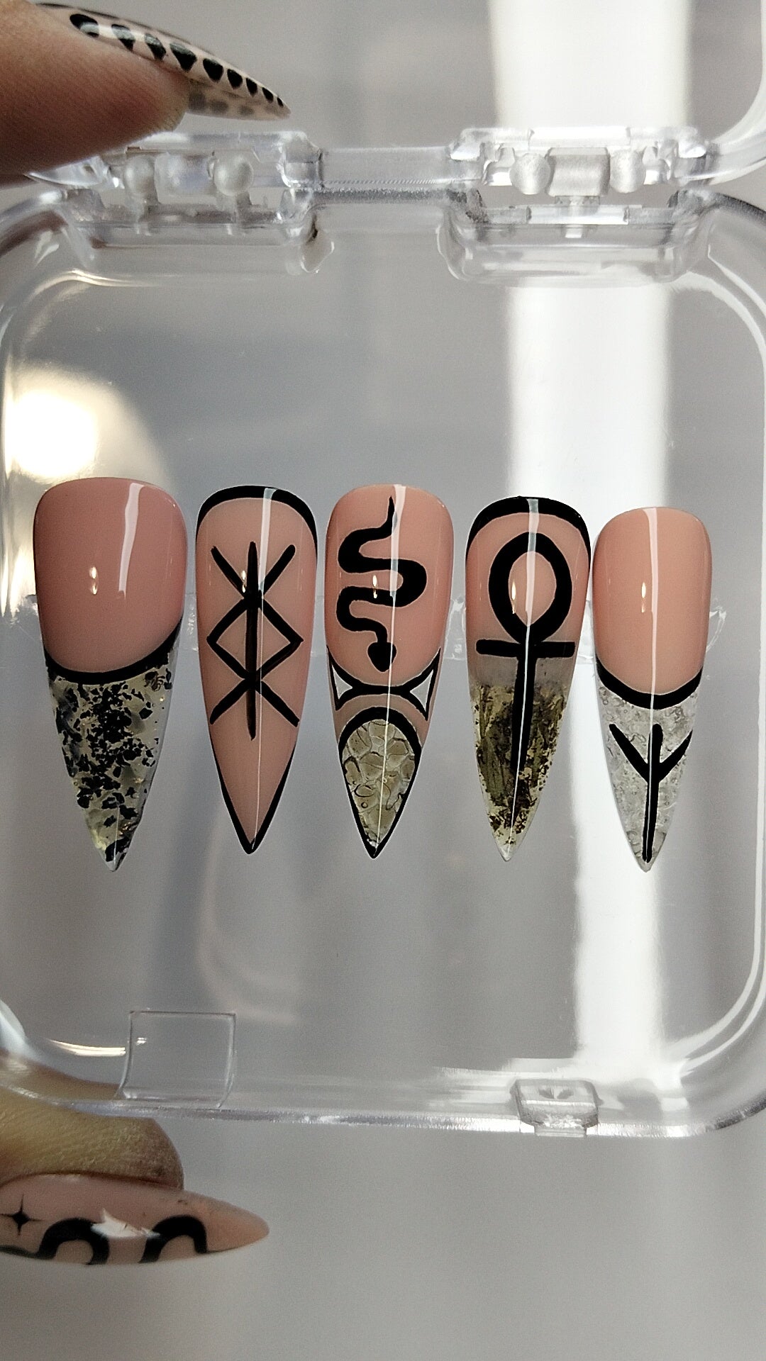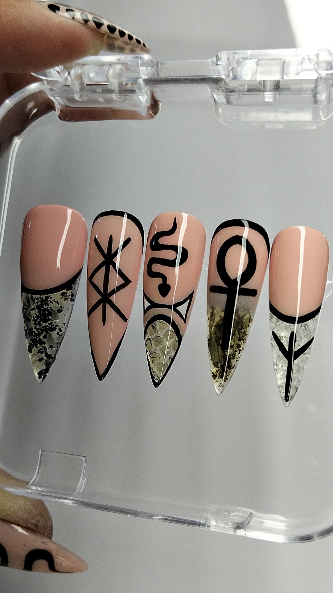 🧂 Pinky – Clear French tip infused with rock salt for grounding, cleansing & boundary‑setting + the powerful Algiz rune for divine protection.