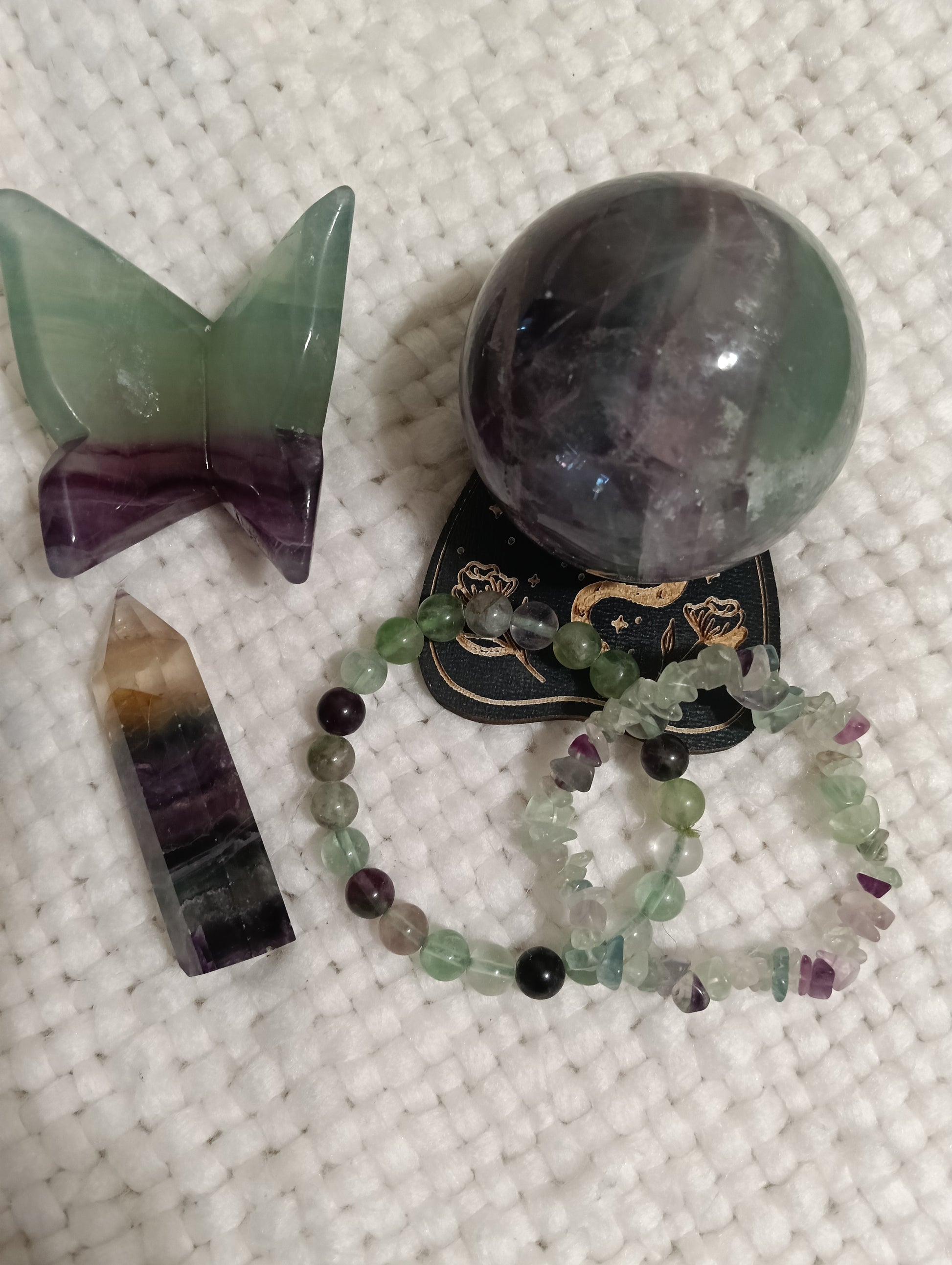 Fluorite medium sphere small, tower, 3D butterfly, 8mm round bead bracelet and chip bracelet.