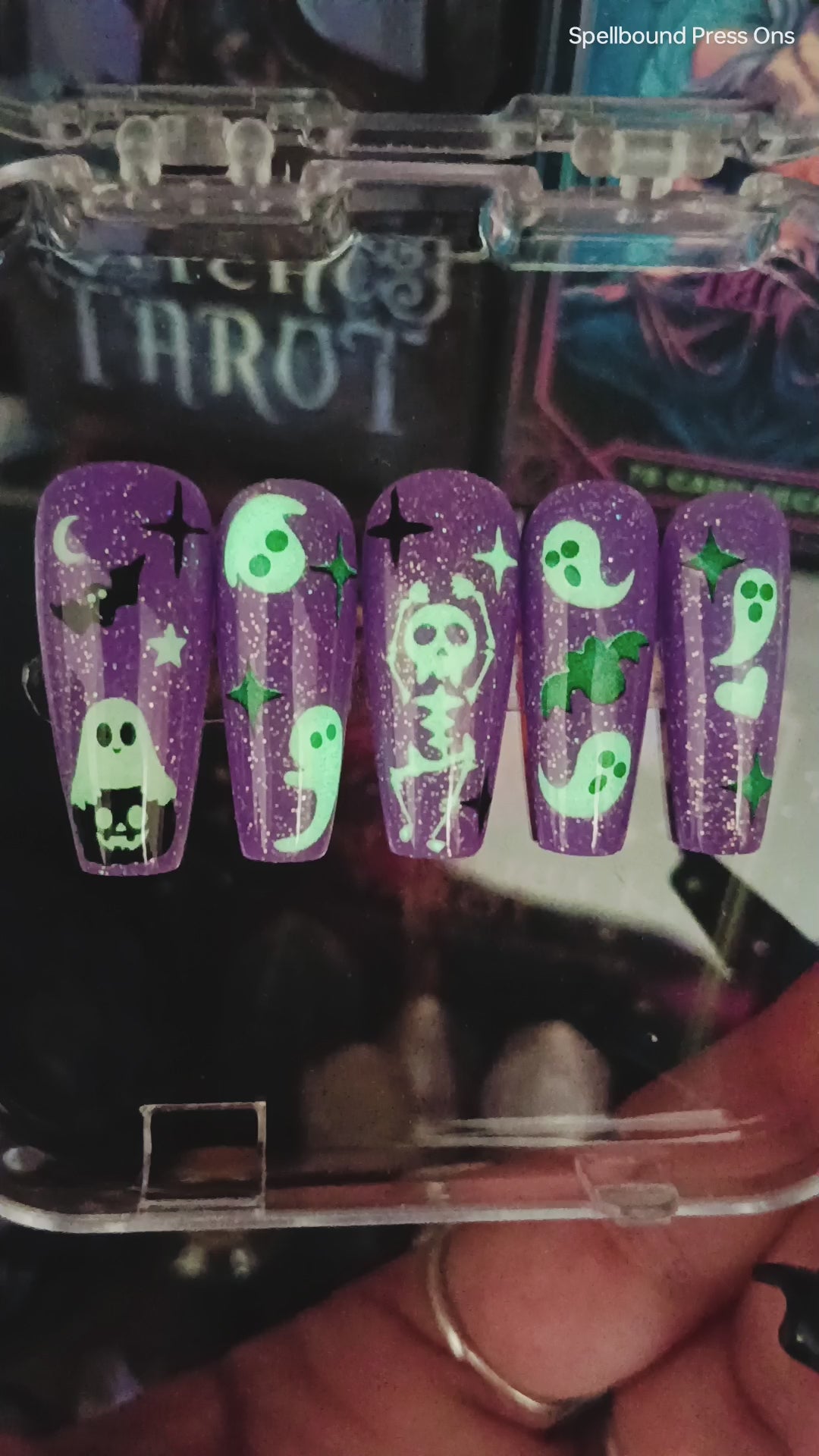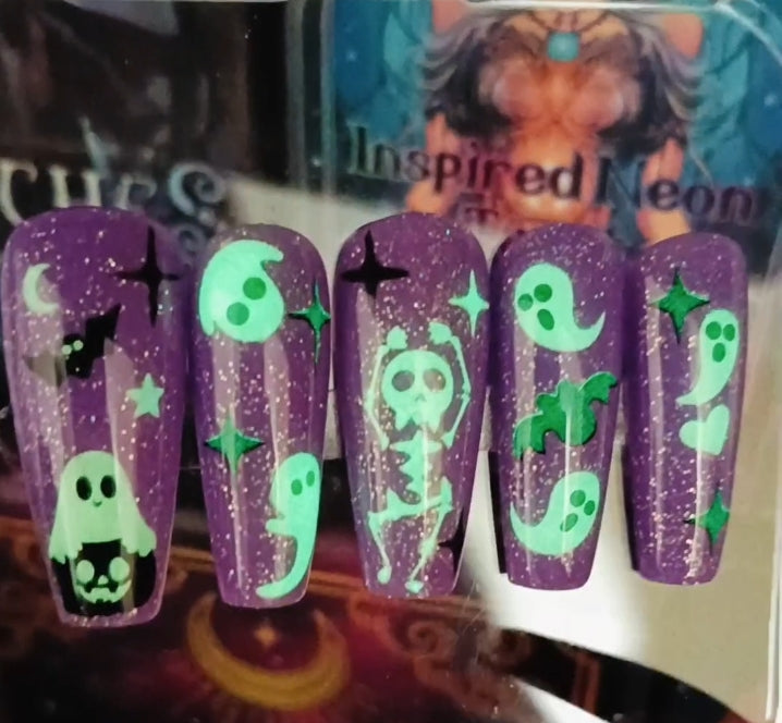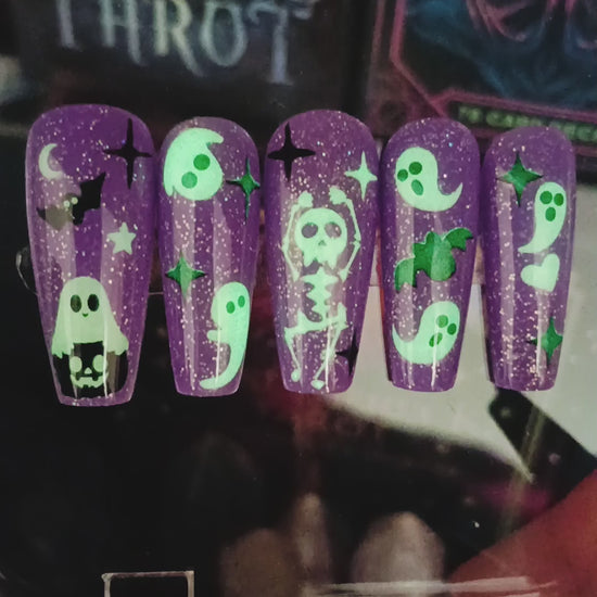 Summon the spirits of sparkle and mischief with Phantom Party—a glitter-drenched Halloween nail set where ghosties giggle and skeletons shimmy under a moonlit sky. Each nail is cloaked in a rich, cosmic purple shimmer, adorned with playful apparitions, fluttering bats, and celestial accents. The centerpiece? A full skeletal guest who’s clearly here for the vibes. And when the lights go low, the ghosts come alive—glowing softly in the dark like enchanted whispers from the other side. Perfect for moonlit rituals, haunted house hopping, or simply casting glam spells all October long.