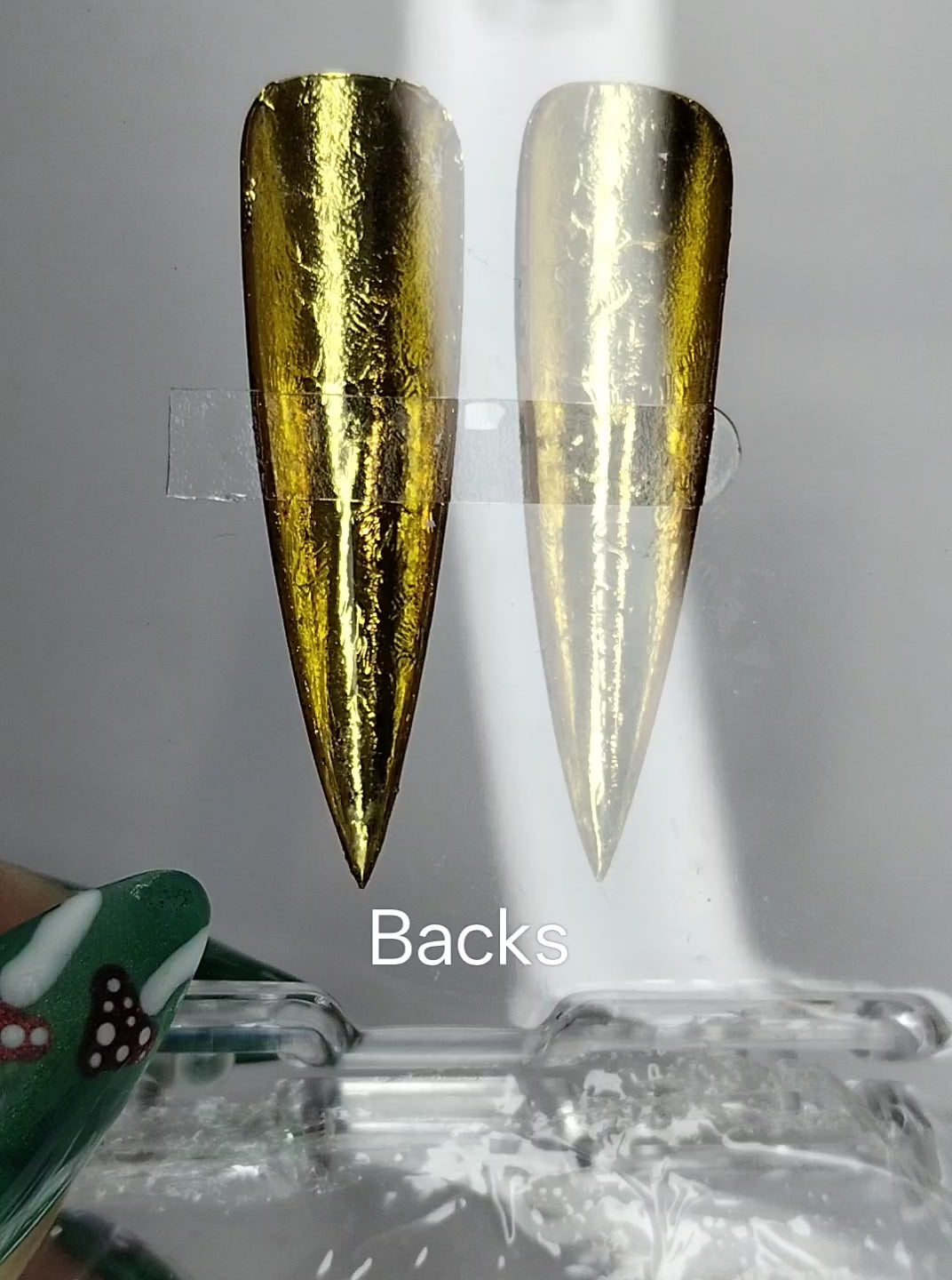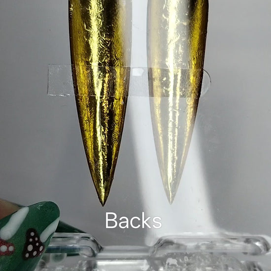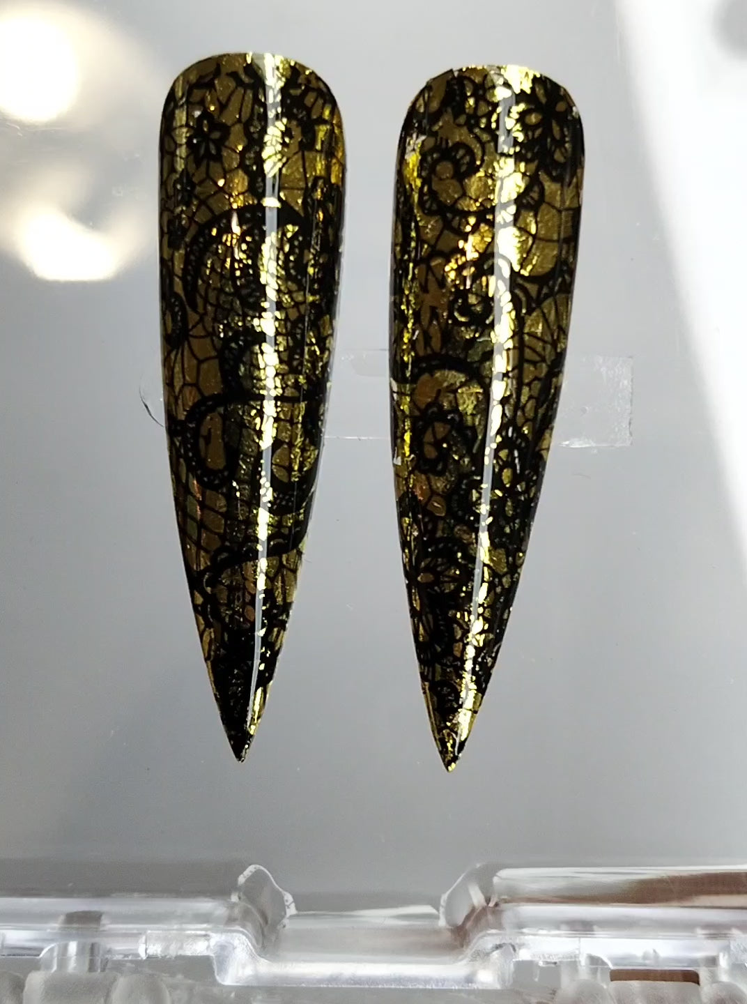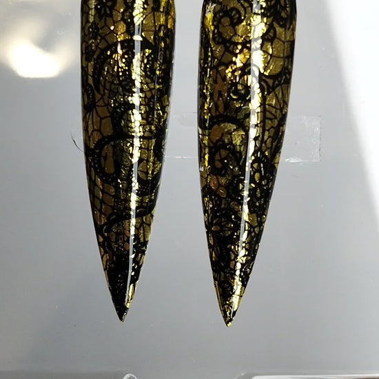 Real gold leaf glimmers beneath a delicate shroud of black lace, creating a mesmerizing interplay of light and mystery. These talismanic tips evoke the allure of hidden treasure—precious, protected, and potent. The backs reveal a marbled dance of molten gold and midnight crackle, like ancient relics unearthed from a forgotten tomb.