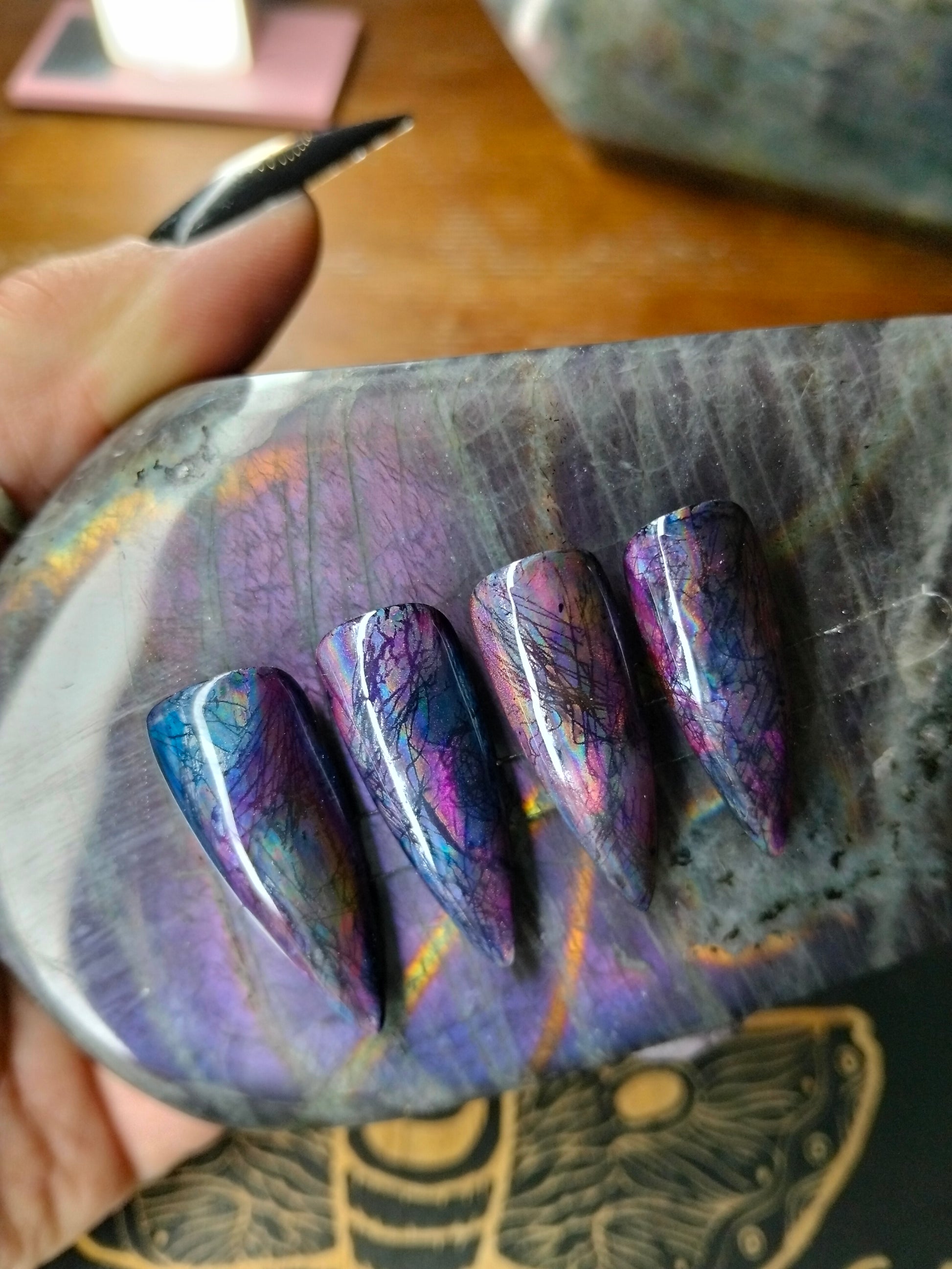 Slip into the shimmer of the unseen with Labradorite Lure, a nail set inspired by the ancient magic of the aurora stone. Each talon is a prism of twilight swirling with deep indigos, stormy teals, and spectral flashes of gold and violet capturing the stone’s legendary labradorescence in every flick of your fingertips.