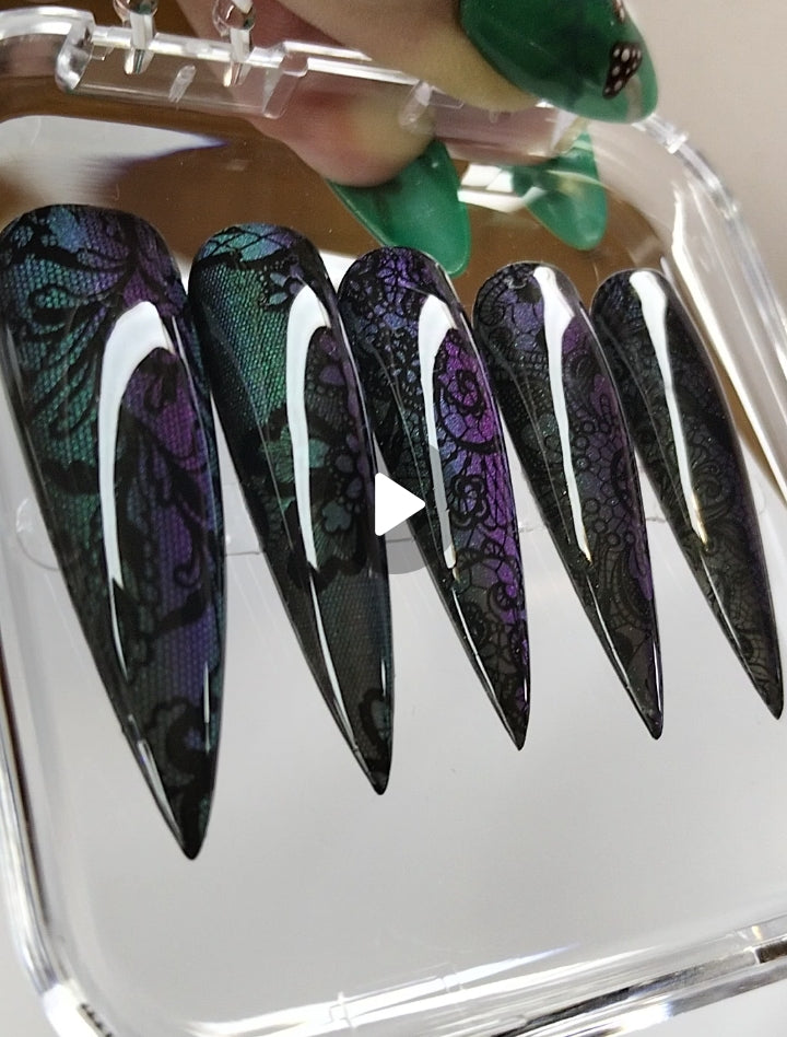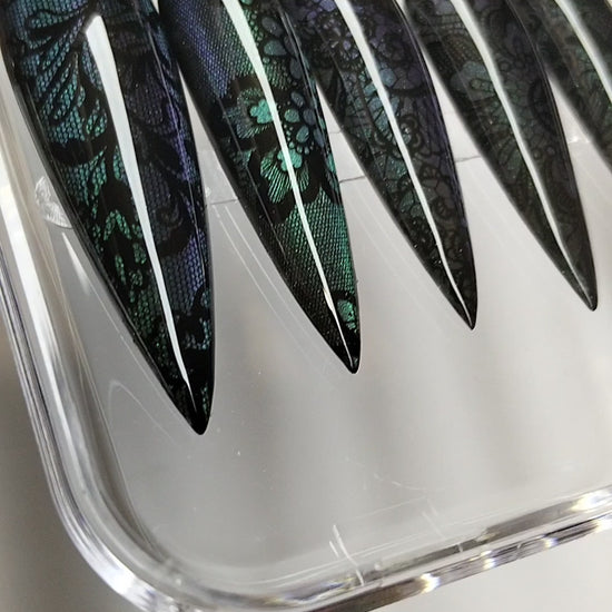 🌒 A seductive shimmer lies beneath the surface of Veil of Thorns, where cat-eye hues shift from deep amethyst to enchanted emerald, veiled in delicate black lace. Each nail feels like a forbidden bloom wrapped in shadow—mysterious, alluring, and fiercely feminine. This set channels the energy of hidden gardens and veiled intentions, perfect for rituals of allure, protection, and transformation. Wear them when you want your magic to speak in whispers and your beauty to bite.