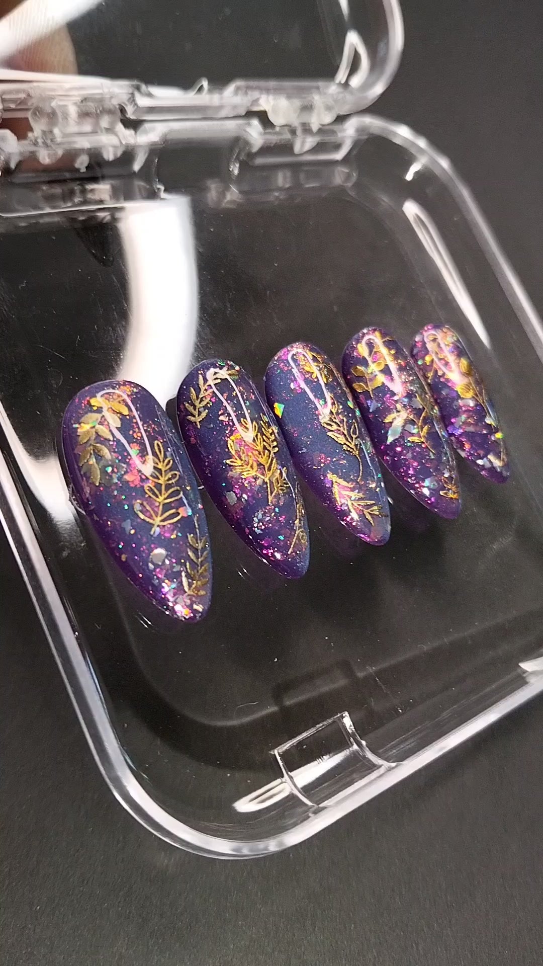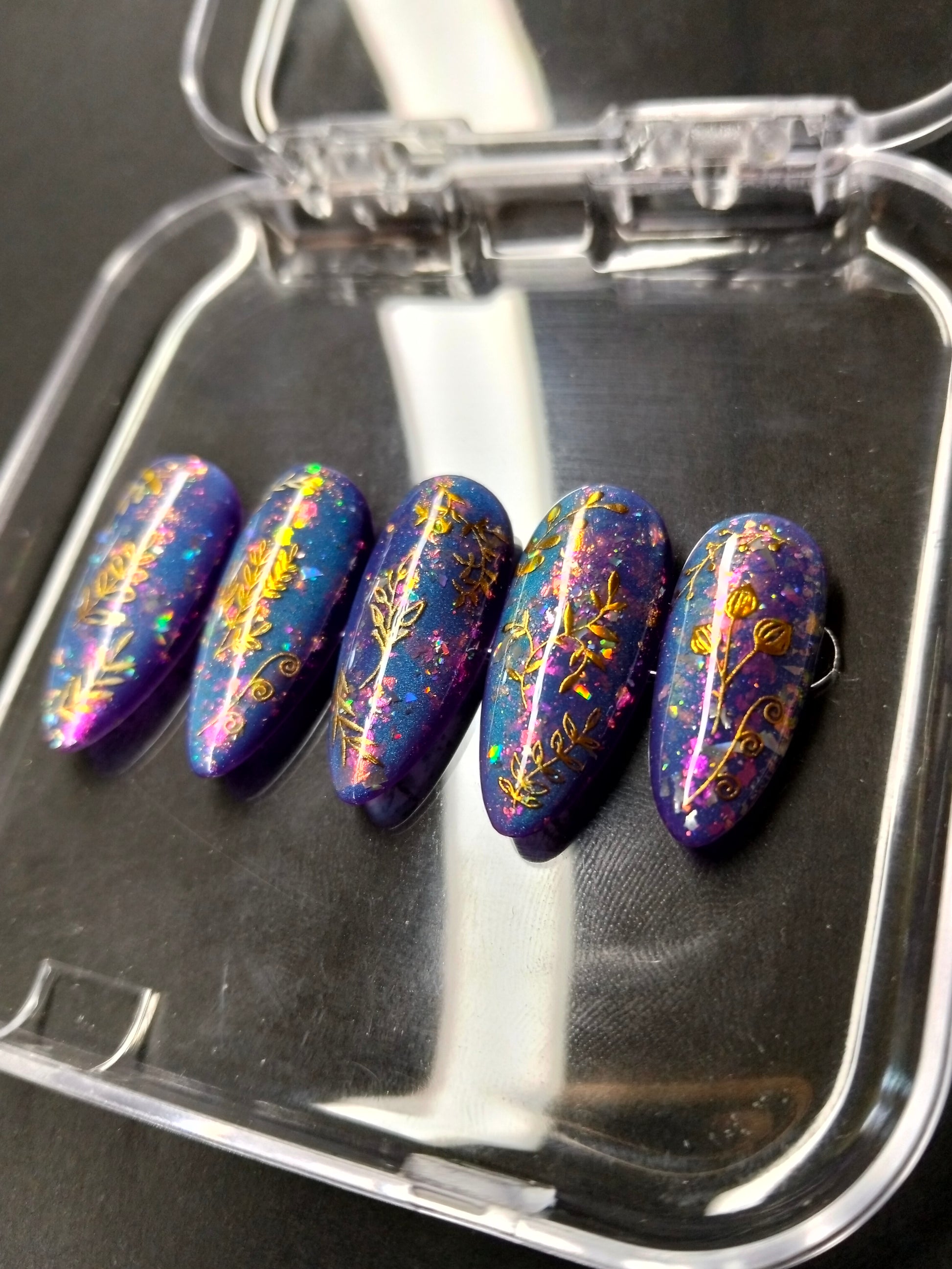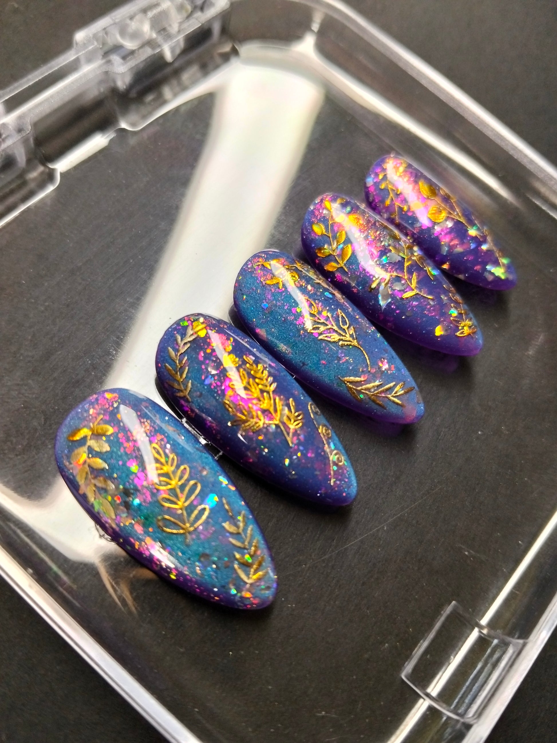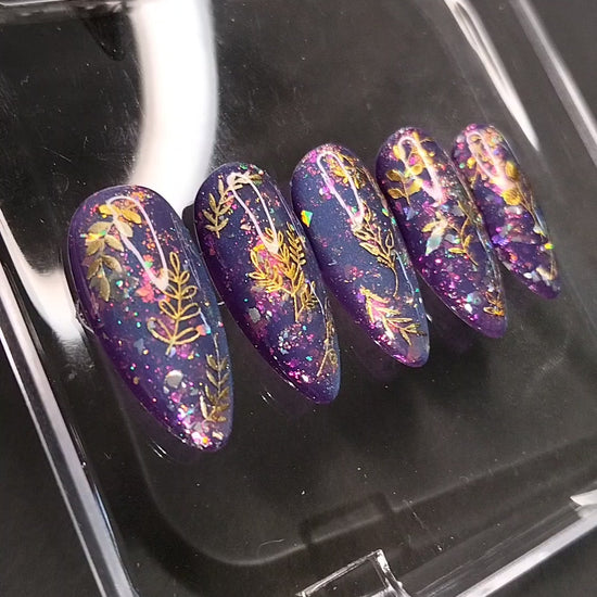 Enchanting Energy pulses with cosmic allure and radiant charm. Each nail features a mesmerizing purple-to-blue cat-eye base that shifts like moonlight on water, casting a magnetic glow with every movement. Scattered chrome flakes catch the light like stardust, while delicate gold designs and ethereal floral motifs bloom across the surface—evoking spells of beauty, vitality, and transformation. This set channels vibrant intention and mystical elegance, perfect for those who embody both grace and power.