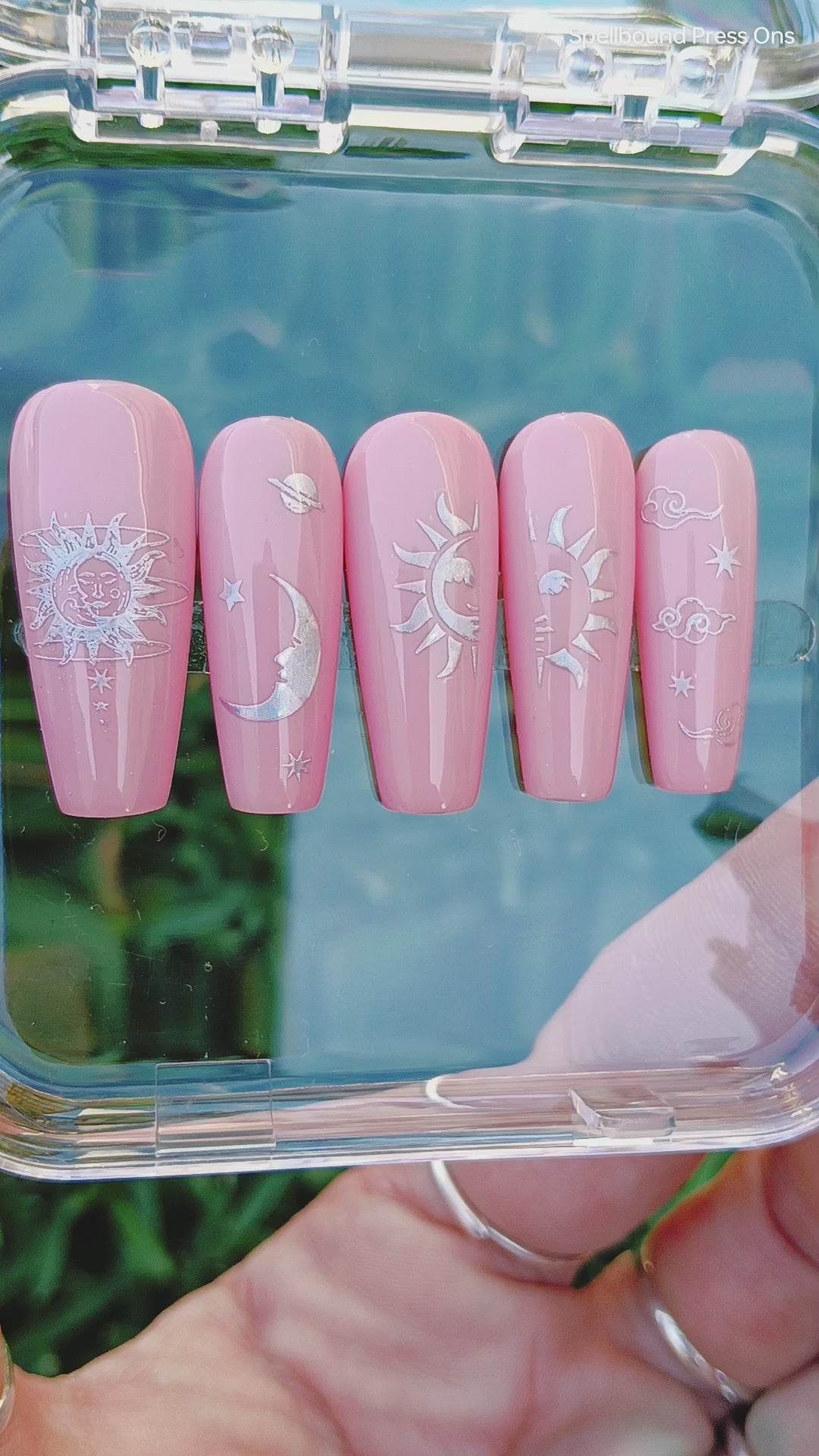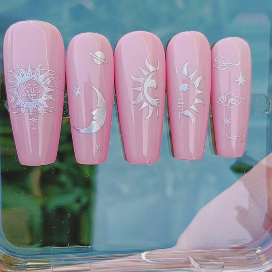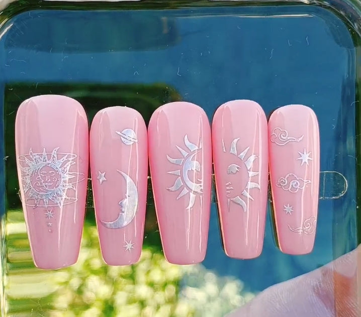 Whether you’re drawn to the cool elegance of silver or the golden glow of abundance, each option transforms this nail set into a wearable altar — a reminder that you are both stardust and sunlight, guided by cycles and crowned in brilliance.