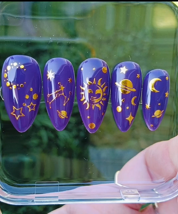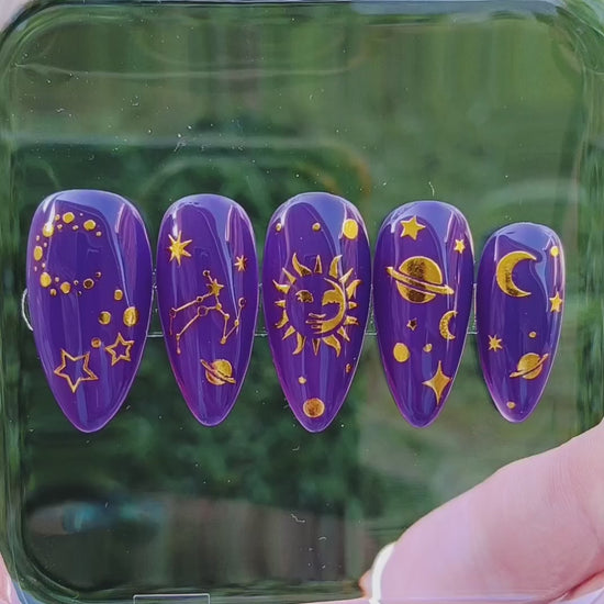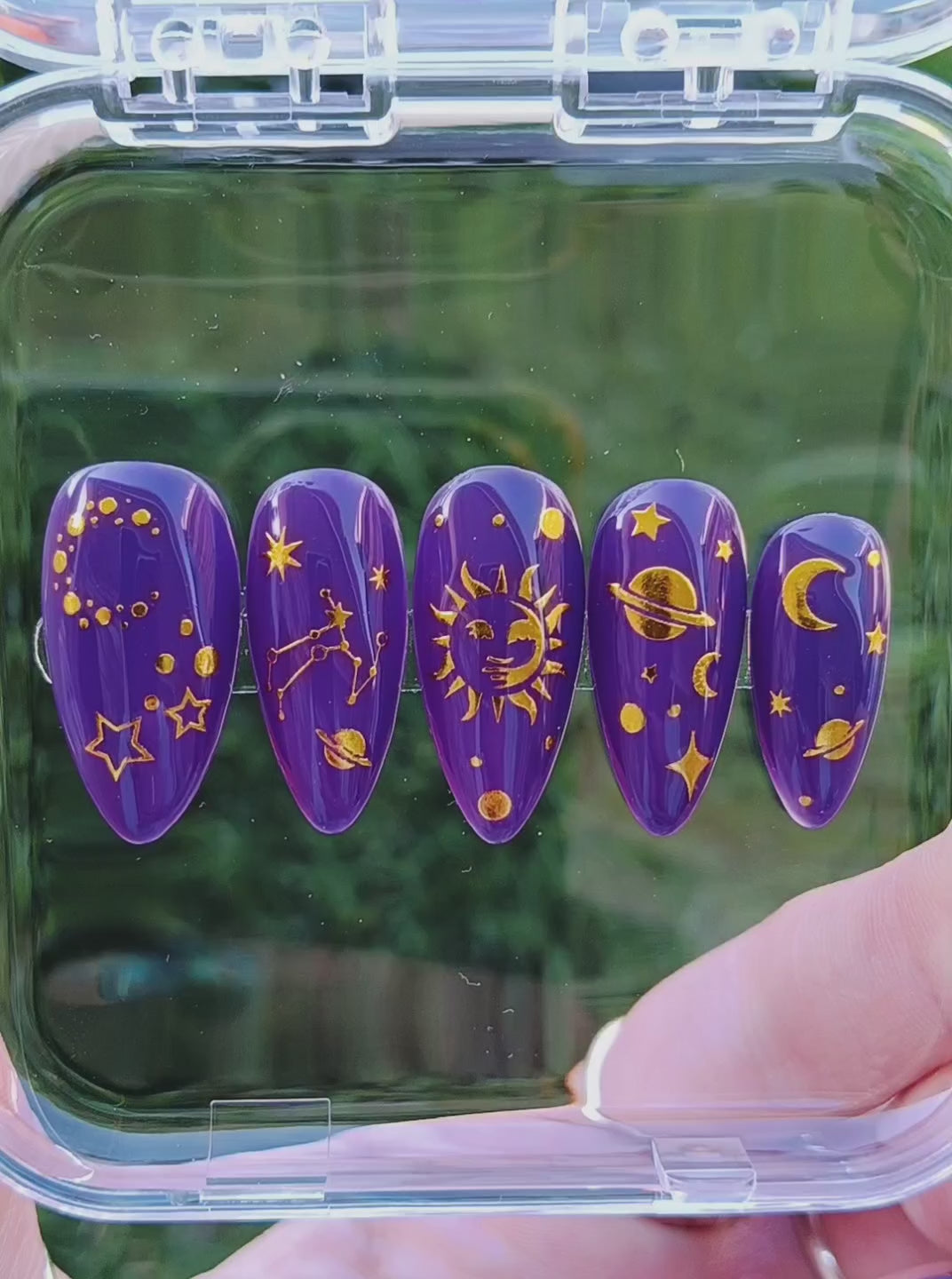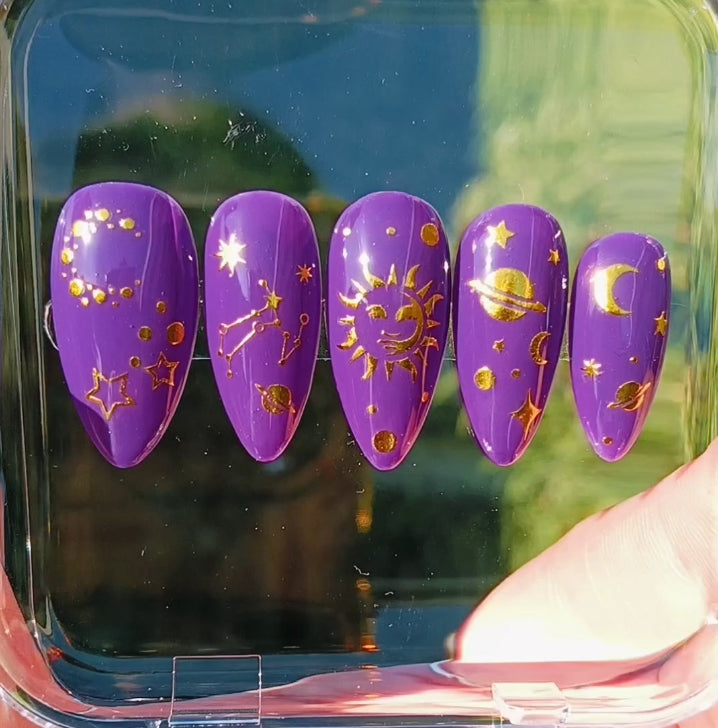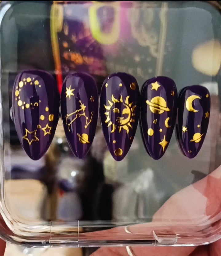 Drift into the velvet depths of the cosmos with Stargazer’s Veil, a celestial nail set designed to channel the mystery and majesty of the night sky. Each deep violet nail is adorned with golden astral symbols—constellations, crescent moons, radiant suns, and planetary rings—like sacred sigils etched across the heavens.