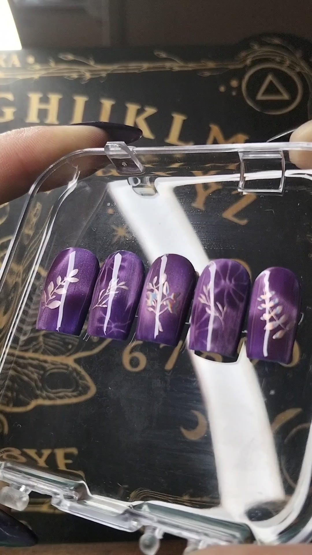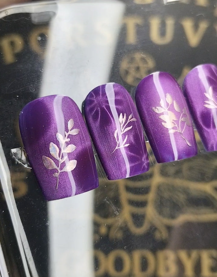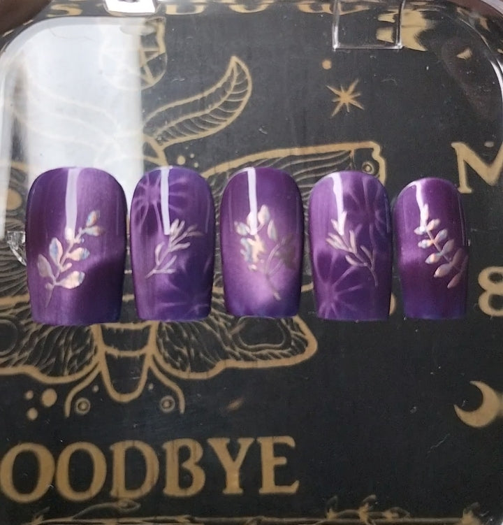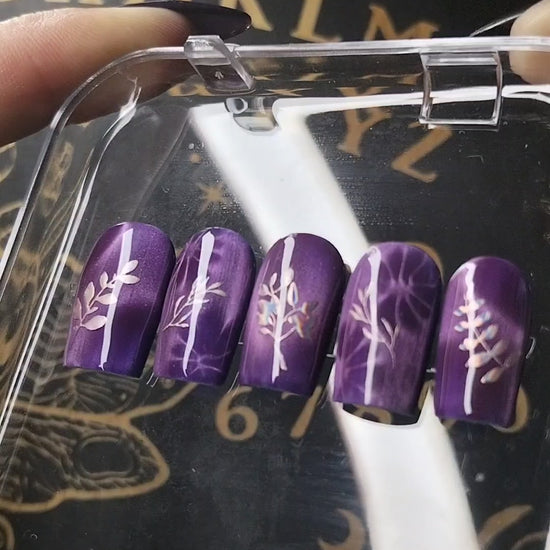 The overall theme evokes intuition, shadow‑work, and quiet power. It’s the kind of set worn by someone who communes with moonlit plants, gathers wisdom from the dark, and trusts the magic that grows in stillness. The nails feel protective and grounding, like a charm crafted from night‑blooming herbs.
